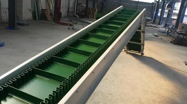 裙邊皮帶輸送機(jī)通過(guò)在皮帶兩側(cè)加裝類(lèi)似裙邊的膠帶,能夠避免物料灑落,在皮帶上間隔一定距離加裝擋板,常用于小顆粒物料的輸送,輸送過(guò)程不會(huì)破壞物料原有特性。